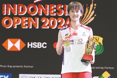 6月9日,陈雨菲在颁奖典礼上。 当日,在雅加达举行的2024年印度尼西亚羽毛球公开赛女单决赛中,中国选手陈雨菲2比1战胜韩国选手安洗莹,夺得冠军。 ■新华社发