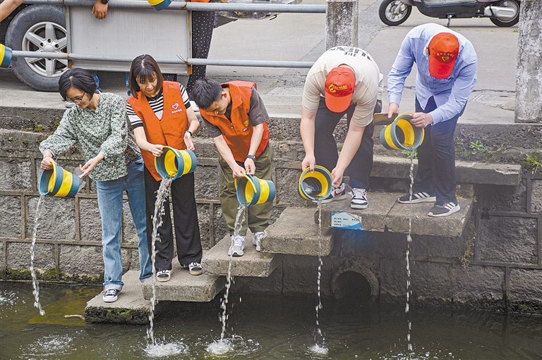 近日,胜山镇组织志愿者在四灶浦、胜山塘横江、油车江等多处水域,增殖放养鱼苗4万多尾,以此举增强公众的环保意识,共同推动生态文明建设。 ■摄影 全媒体记者 蒋亚军 通讯员 胡立琼