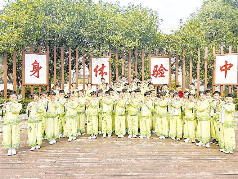 阳光校园,班班有特色,班班有文化。近日,阳光实验学校小学部对申报器乐特色的班级进行了考核。过去一学期来,各班学生日日与笛声为伴,在考核现场他们配合默契、全情投入,以悠扬笛声、阵阵乐音展现了班级特色及学校“素质发展五个一”的特色。 ■摄影 全媒体记者 陆铭铭 通讯员 龚可爱 孙宇聪