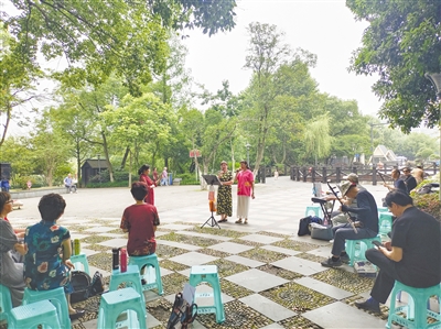 初夏清晨的峙山公园,轻风徐徐、绿荫蔽日,市民纷纷打卡享受这惬意的清凉。这不,曲声悠扬处,一群戏剧爱好者正在尽情演绎经典唱段。 ■摄影 全媒体记者 王烨江