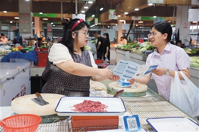 近日,农行前湾新区支行工作人员来到庵东镇集贸市场,开展优化支付服务宣传活动,向广大群众介绍货币知识以及该行本外币兑付服务,并为商户送上精心准备的零钱包。 ■摄影 全媒体记者 胡杭燕 通讯员 施芳芳 封佩翎