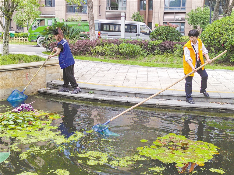 近日,宗汉街道星光社区网格员携手白金湾小区绿城物业幸福里志愿者开展小区景观河道内水生植物清理,共同打造洁美水环境,共建社区幸福里。 ■摄影 全媒体记者 蒋亚军 通讯员 潘美琴