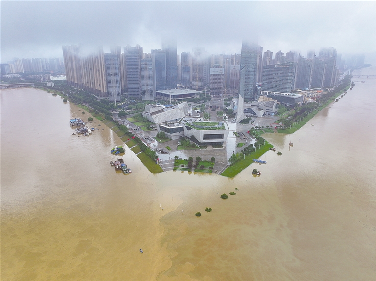 6月26日,长沙北辰三角洲沿岸观光平台被江水淹没(无人机照片)。 受持续降雨影响,6月26日3时30分,湘江2024年第3号洪水形成,两岸防汛压力持续增加。湘江长沙段水位持续上涨,26日13时32分,湘江长沙水文站水位达36.75米,超警戒水位0.75米。湖南省水文水资源勘测中心发布通告,提醒沿河有关单位及公众加强防范,注意避险。 ■新华社发