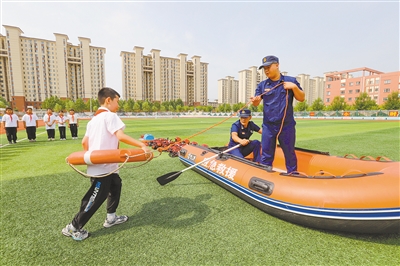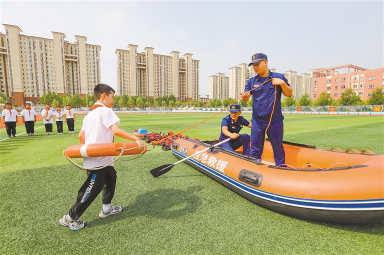 6月27日,在河北省秦皇岛市卢龙县第五实验小学,消防救援人员向学生演示实施水上救援。