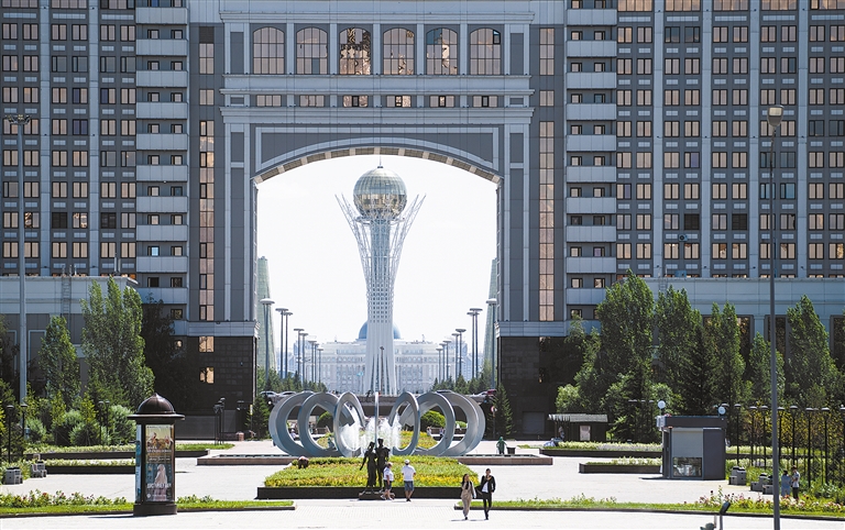 这是6月29日在哈萨克斯坦首都阿斯塔纳透过一座建筑拍摄的巴伊杰列克观景塔。 阿斯塔纳是哈萨克斯坦共和国首都,伊希姆河穿城而过,夏季凉爽、冬季严寒,生态环境良好。 阿斯塔纳地标性建筑极具特色,在蓝天白云的映衬下勾勒出美丽的城市风景线。 ■新华社发