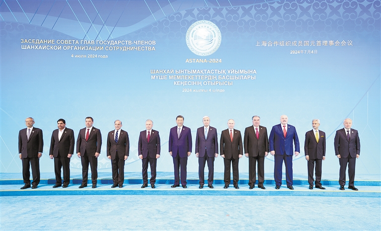 当地时间7月4日上午,国家主席习近平在阿斯塔纳独立宫出席上海合作组织成员国元首理事会第二十四次会议。这是习近平同上海合作组织成员国领导人集体合影。 ■新华社发