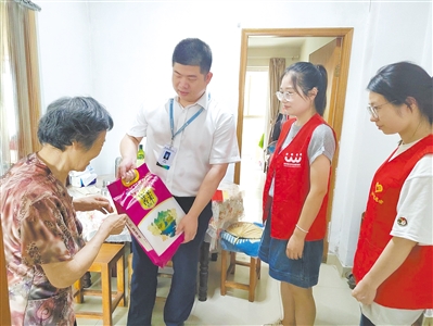 慈晓客户端慈圈“圈友”汇聚微光:宗汉街道星光社区低保户收到社区巾帼志愿者和农商行工作人员送来的“和美百姓米”。