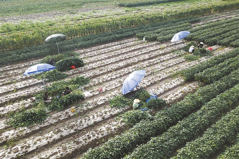 眼下正值毛豆最佳采收期,在周巷镇一处农田,数名农民在一把把遮阳伞下采摘毛豆。农人勤劳的身影,绘就夏日丰收图。