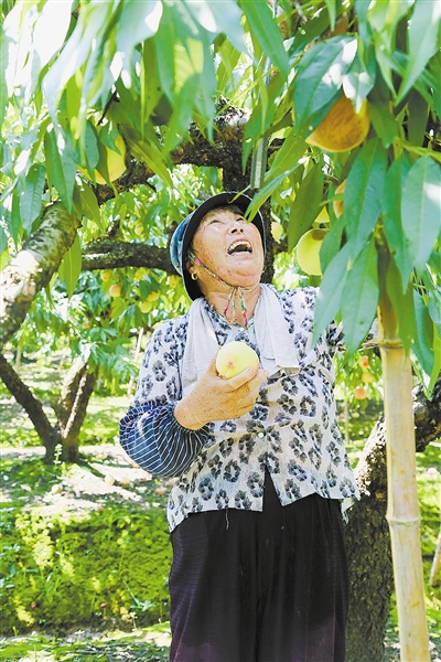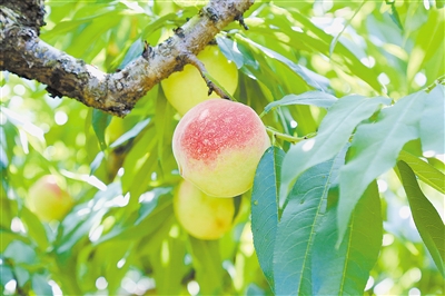 桃林里,粉嘟嘟的桃子挂满枝头,在绿叶的衬托下分外可爱。“游古村、吃鲜桃,去年朋友从慈溪带了水蜜桃给我,一直念念不忘,今年特地从上海自驾过来吃桃!”游客张小姐说。“我们古窑浦产出的桃子,因为种在海边的盐碱地里,水分充足、糖度更高,果形也很美,而且皮韧易剥、香鲜味美。近两年,又集体打出了‘慈溪海桃’这一新的IP。”提到海桃,古窑浦村党委书记叶善根总有说不完的话。他自豪地告诉记者,叫响了新IP,坚持走精品路线,桃子品质不断提升,售价也随之增长。