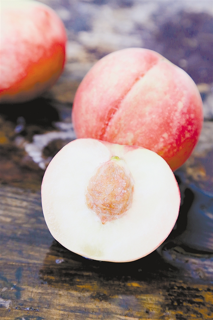 白凤水蜜桃上市时间为每年的7月上旬至7月下旬,单果重集中在5-8两之间,显著特点为个大形美,肉质细腻,香味浓郁,口感较好,1/3红即为成熟,9成熟可撕皮。
