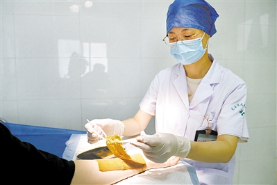 7月16日,市皮肤病医院的医生正细心地为湿疹患者实施溻法治疗。溻法和浸渍法统称为溻渍法,是中医外治方法的一种,主要是通过湿敷、淋洗、浸泡对患处的物理作用,以及不同药物对患部的药效作用而达到治疗目的,在中医外治疗法中以操作简单、安全有效、适应症广而著称。