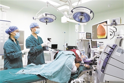近日,市人民医院医疗健康集团消化内科医生正在给患者进行ESD手术。据悉,ESD微创手术让更多早期消化道癌能够在内镜下一次性完全切除,保留了消化道的完整性,免除了开刀的痛苦和器官的切除。相比传统切除手术,具有不开刀、创伤小、恢复快、费用低等优点,是目前临床内镜下切除消化道早期肿瘤的首选治疗方案。