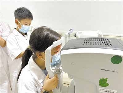 日前,文谷外国语小学晨曦中队的同学们受邀前往市红十字医院,参加“小小医生”暑期特别体验活动。学习预防疾病的知识、动手包中药包……这次小医生职业体验活动,为孩子们种下了梦想的种子。图为小小“萌医”正在学习使用眼科机器。 ■摄影 全媒体记者 黄凯 通讯员 姚益女 胡晓云