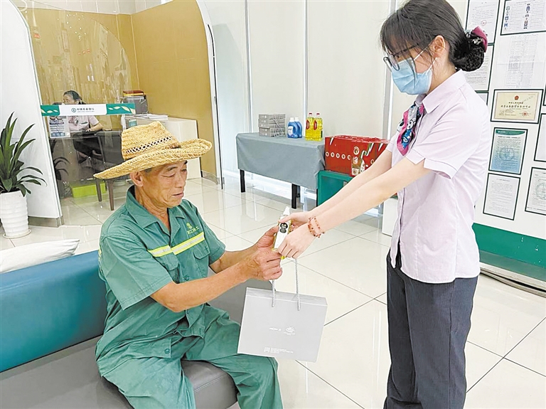 近日,农行前湾新区支行开展户外劳动者关怀活动,为外卖骑手、快递员、建筑工人和环卫工人等户外劳动者送上消暑物品,并在网点设立“清凉驿站”,方便他们进入网点休息纳凉。 ■摄影 全媒体记者 胡杭燕 通讯员 施芳芳 邹佳楠