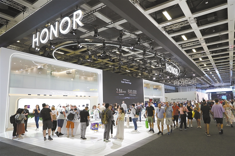 这是9月6日拍摄的德国柏林国际消费电子展荣耀展区。 2024年柏林国际消费电子展6日拉开帷幕。今年是展会创办100周年,人工智能与可持续发展成为关注焦点。中国企业近年来在柏林国际消费电子展上表现抢眼。本届展会有不少中国企业携最新产品和技术亮相,吸引众多参观者驻足观看体验。 ■新华社发