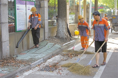 秋风渐起,落叶增多,增加了环卫工人的工作量,图为环卫工人正在使用鼓风机等专业设备清扫落叶。 ■摄影 全媒体记者 黄凯