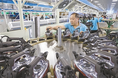 近年来,周巷镇的宁波爱佳电器有限公司出口增长明显。该公司是一家集设计开发与生产制造电熨斗、煎烤器等小家电于一体,具有自营进出口权的科技型企业,产品主要销往欧美市场。今年来公司订单不断,全年预计销售达8.5亿元,同比增长8.9%。图为近日该公司电熨斗组装流水线火爆的生产场景。