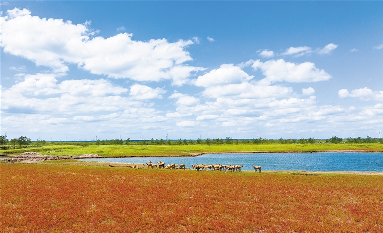 9月23日,麋鹿在江苏东台条子泥湿地觅食。时下,秋色斑斓,构成一幅幅美不胜收的秋日画卷。