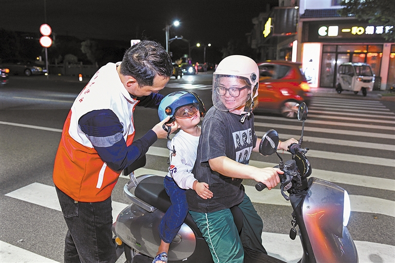 近日,掌起镇“小墙热线”服务团队携手陈家村、柴家村工作人员,在镇内主要交通路口开展文明交通倡导活动,并向孩子们送上安全头盔,让孩子们把安全意识“戴”回家。 ■摄影 全媒体记者 王烨江 通讯员 茅译文