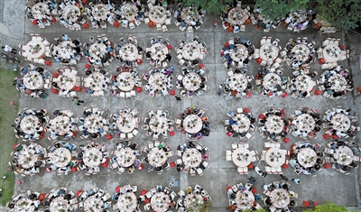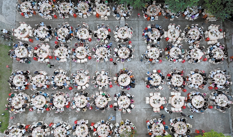 10月19日,在鹿寨县拉沟乡木龙村五家屯,游客参加药膳美食百家宴(无人机照片)。 当日,广西柳州市鹿寨县拉沟乡举办第三届药王节,通过药膳美食展示等形式多样的活动,吸引游客前来体验游玩。 ■新华社发