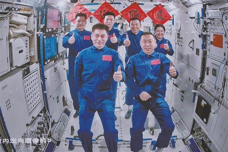 据中国载人航天工程办公室消息,在载人飞船与空间站组合体成功实现自主快速交会对接后,神舟十九号航天员乘组从飞船返回舱进入轨道舱。北京时间2024年10月30日12时51分,在轨执行任务的神舟十八号航天员乘组顺利打开“家门”,欢迎远道而来的神舟十九号航天员乘组入驻中国空间站,“70后”“80后”“90后”航天员齐聚“天宫”,完成中国航天史上第5次“太空会师”。随后,两个航天员乘组拍下“全家福”,共同向牵挂他们的全国人民报平安。 ■新华社发
