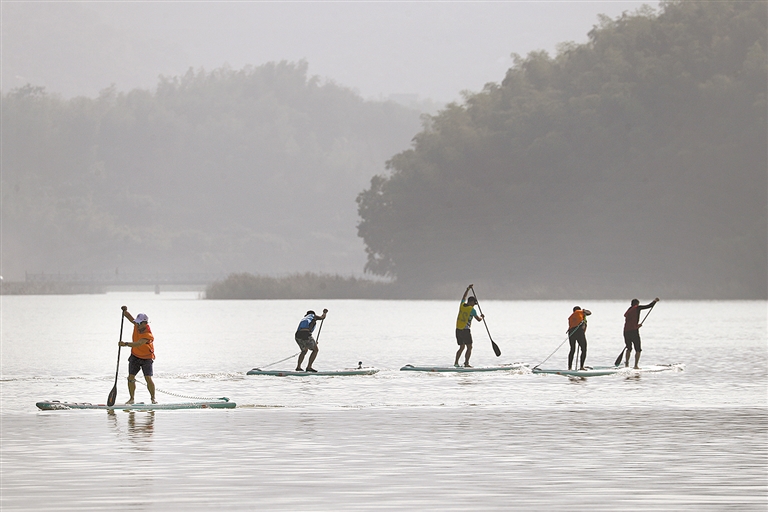 作为一项新兴的水上运动项目,桨板运动正逐渐成为时尚生活的一部分。数据显示,共有来自国内外的179名选手报名参赛,与此同时,本次比赛还吸引了一位来自巴拿马的选手。“我是第二次来参加观海卫镇的桨板公开赛了。”来自衢州的选手冯刚强告诉记者:“今年上半年,我参加了‘鸣鹤古镇杯’桨板邀请赛,白洋湖优美的环境、平静的水体带给我们绝佳的参赛体验,所以看到这个比赛要举行,我第一时间就报了名。”