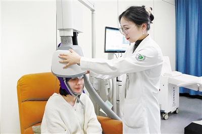 近日,市第七人民医院精神康复科医生正在用斯坦福疗法衍生的加速经颅磁治疗为患者进行治疗。经颅磁刺激技术是一项非侵入性神经调控技术,利用脉冲磁场穿透颅骨,产生感应电流刺激神经元细胞,促进突触可塑性,调节大脑皮层兴奋性,实现皮质功能重建,从而治疗精神心理疾病或神经系统疾病。 ■摄影 全媒体记者 王烨江 通讯员 沈燕
