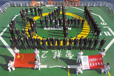 这是考察队队员在“雪龙2”号上排列成“S41”字样的队形合影留念。