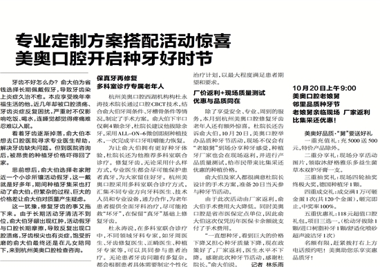 除了享受安全、专业、周到的服务,本月到杭州美奥口腔修复牙齿老年人还有额外惊喜。杜院长还告诉俞大伯,10月20日,美奥口腔举办品质种牙节活动,现场不仅会有“老娘舅”到场分享种牙感受,种植牙厂家也会在现场返利,并进行产品质量测试,给市民带来比集采还优惠的种植价格。