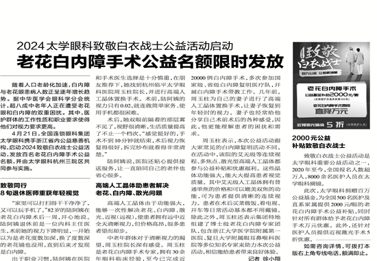 4月21日,全国连锁眼科集团太学眼科携手浙江省内公益慈善机构,启动2024致敬白衣战士公益活动,发放百名老花白内障手术公益名额,并由太学眼科杭州三院区共同参与实施。