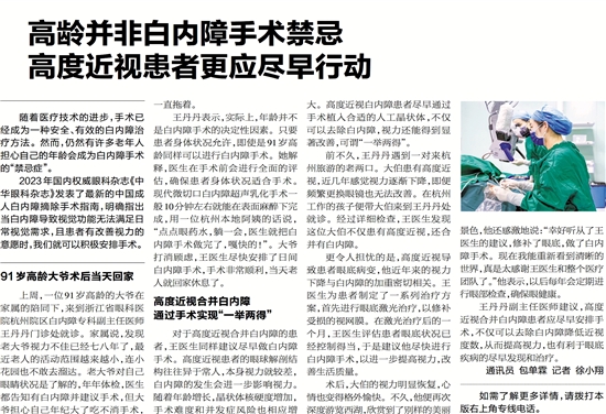 王丹丹表示,实际上,年龄并不是白内障手术的决定性因素。只要患者身体状况允许,即使是91岁高龄同样可以进行白内障手术。她解释,医生在手术前会进行全面的评估,确保患者身体状况适合手术。现代微切口白内障超声乳化手术一般10分钟左右就能在表面麻醉下完成,用一位杭州本地阿姨的话说,“点点眼药水,躺一会,医生就把白内障手术做完了,嘎快的!”。大爷打消顾虑,王医生尽快安排了日间白内障手术,手术非常顺利,当天老人就回家休息了。