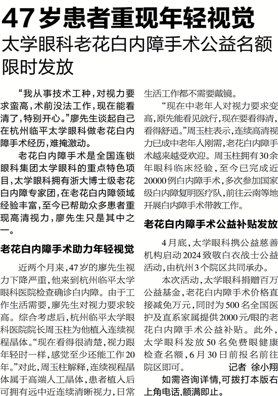 本次活动,太学眼科捐赠百万公益基金,老花白内障手术价格直接减免万元,同时为500名全国医护及直系家属提供2000元/眼的老花白内障手术公益补贴。此外,太学眼科发放50名免费眼健康检查名额,6月30日前报名前往院区即可。 记者 徐小翔