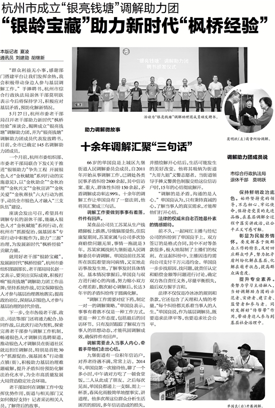 5月27日,杭州市委老干部局召开老干部助力新时代“枫桥经验”座谈会,揭牌成立“银亮钱塘”调解助力团,并为“银亮钱塘”调解助力团成员代表发放聘书。目前,全市已确定145名调解助力团成员。