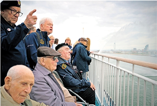 6月4日,在从英国朴茨茅斯启航的渡轮上,老兵们参加纪念“D日”80周年活动。