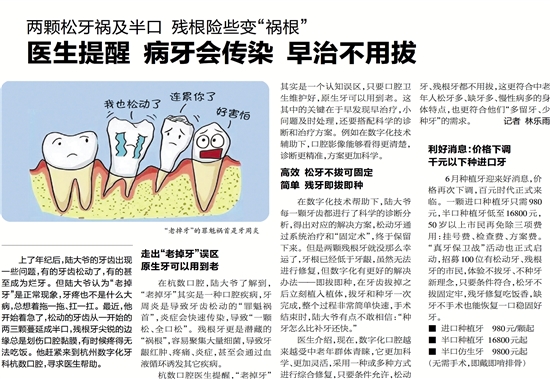 在杭数口腔,陆大爷了解到,“老掉牙”其实是一种口腔疾病,牙周炎是导致牙齿松动的“罪魁祸首”,炎症会快速传染,导致“一颗松、全口松”。残根牙更是潜藏的“祸根”,容易聚集大量细菌,导致牙龈红肿、疼痛、炎症,甚至会通过血液循环诱发其它疾病。