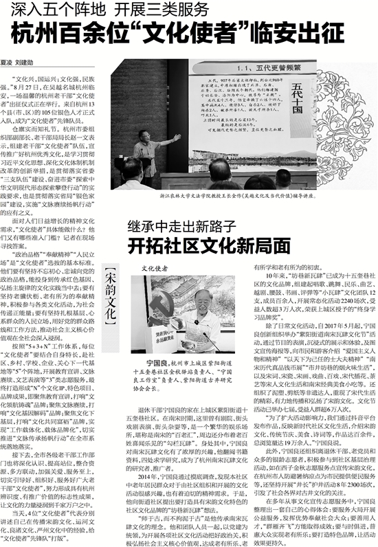 “文化兴,国运兴;文化强,民族强。”8月27日,在吴越名城杭州临安,一场温馨的杭州老干部“文化使者”出征仪式正在举行。来自杭州13个县(市、区)的105位银色人才正式入队,成为“文化使者”先锋队员。