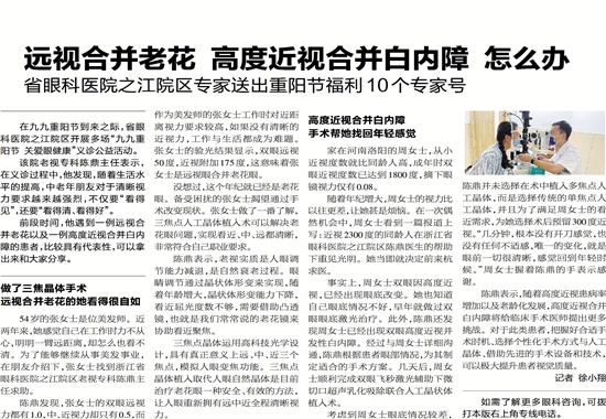 省眼科医院之江院区专家送出重阳节福利10个专家号