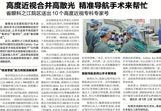 多年来,他四处求医,却始终没有得到想要的结果。就在吴先生心灰意冷时,一则新闻引起他的注意:一位近视度数2300度的同龄人在省眼科之江院区陈鼎主任帮助下顺利摘镜,视觉质量得到较大提升。