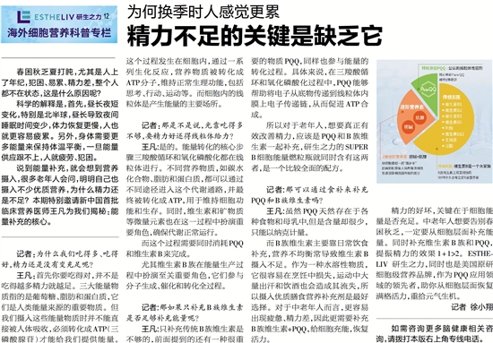 精力的好坏,关键在于细胞能量是否充足。中老年人想要告别春困秋乏,一定要从细胞层面补充能量。同时补充维生素B族和PQQ,提振精力的效果1+1>2。ESTHELIV 研生之力,同时也是美国原研细胞级营养品牌,作为PQQ应用领域的领先者,助你从细胞层面恢复满格活力,重拾元气生机。