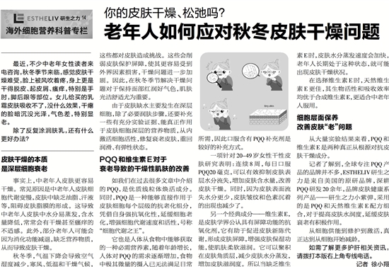 记者了解到,全球专注PQQ产品的品牌并不多,ESTHELIV研生之力是来自美国的原研品牌,深耕PQQ研发20余年,品牌皮肤健康系列产品——研生之力小紫弹,采用的是PQQ和天然维生素E配方组合,对于提高皮肤水润度,延缓皮肤衰老有积极作用。