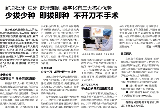 如果您有松动牙、残根牙、缺牙等问题,不妨到杭数口腔,让数字化给您更好的解决方案。杭数口腔积极响应浙江省老龄产业协会发起的“杭城口福行动”,推出惠民看牙活动,您可以通过本版右上方电话报名。