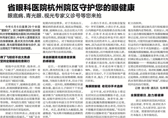 浙江省眼科医院杭州院区送出郑斌、李军花、陈君虹各5个专家号,为大家评估、设计治疗方案。需要预约的读者可拨打本版右上角专线电话。