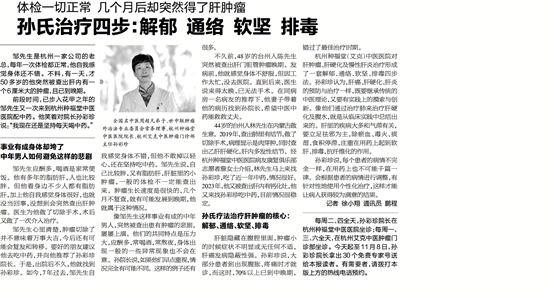 邹先生心里清楚,肿瘤切除了并不意味着万事大吉,今后还有可能会复发和转移。要好的朋友建议他去吃中药,并向他推荐了孙彩珍院长。于是,出院后不久,他就找到孙彩珍。如今,7年过去,邹先生自我感觉身体不错,但他不敢掉以轻心,还在坚持吃中药。邹先生说,自己比较胖,又有脂肪肝,肝脏里的小肿瘤,一般的体检不一定能查出来。肿瘤生长速度是很快的,几个月不复查,就有可能发展到晚期,他就属于这种情况。