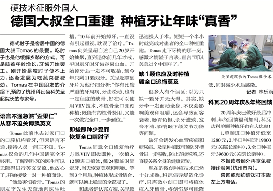 德式肘子是客居中国的德国大叔Tomas的最爱。吃肘子也是他缓解乡愁的方式。可是随着年龄增长,牙齿开始罢工。刚开始是咬肘子使不上力,逐渐发展为吃蔬菜都费劲。Tomas在中国朋友的介绍下,预约了杭州科瓦齿科关呈超院长的专家号。