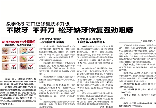 最终的修复结果令陈大伯非常满意。他说,牙齿肯定是原装的好,吃东西香。