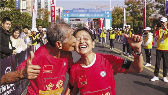 10月14日,2024年浙江省老年摄影大展颁奖仪式在丽水举行。上图为银奖作品《赛道之吻》,韩强摄影,捕捉了一对金婚夫妇在马拉松比赛中笑着亲吻的幸福时刻。本次大展终评评委会主任裘志伟表示:“老年朋友用心、用情、用功为美丽浙江画像、为乡村振兴写真,讲述‘幸福养老、浙里更好’的故事。” 缪悦 通讯员 吴莹军
