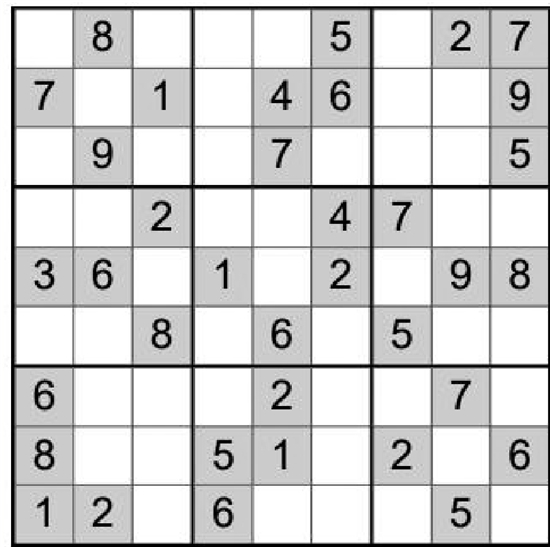 在空白格填入数字,使其每行、每列、每一个粗线格(3×3)内的数字为1-9,不重复。