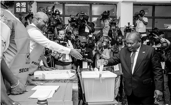 图为莫桑比克总统纽西当天上午在马普托一所中学的投票站投票。 据新华社、央视新闻