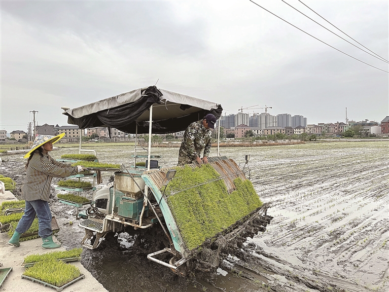 昨日上午,临浦镇临一村萧山绿保家庭农场的水稻种植基地里,两台自走式插秧机在水田里来回穿梭,所过之处,一株株翠绿的秧苗从秧盘上有序滑落,整齐地插入水田之中,为稻田披上了一袭绿色新装。