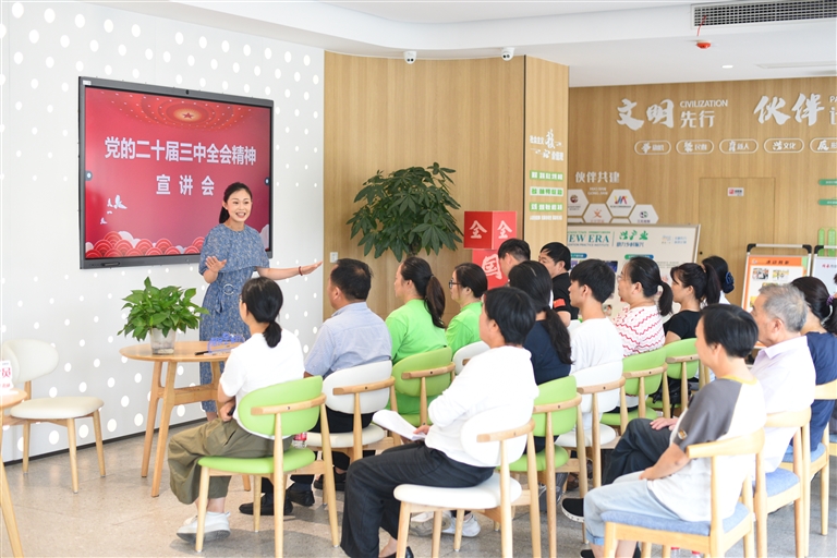 在党湾,勤诚之声——“三学三话”青年理论宣讲颇受欢迎,青年宣讲员们用一线的视角反映党湾的发展成就,将理论实践深入田间地头。宣讲队伍的名气大了,“市场”也就广阔了。宣讲员常常会出现在围垦馆、老年食堂、农家院子等地方,与群众坐在一起,用诗朗诵、评书等通俗易懂的艺术形式进行宣讲。越来越多的群众可以“沉浸式”了解宣讲内容,这也是“伙伴”的力量。
